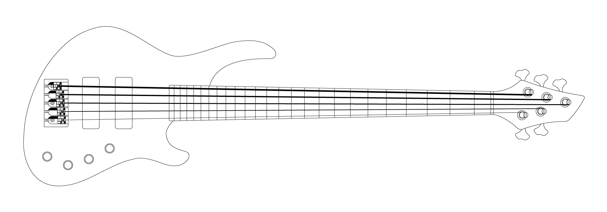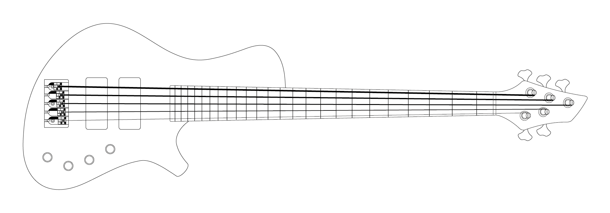This bass started of as a guitar design but I quickly realised it would work well as a bass, having only built one guitar in this style and many basses I think the latter was the better choice. This bass is the most compact of all my designs often making for a very lightweight instrument. The design also works very well with shorter scale lengths, something an increasing number of players are beginning to see the advantage in.