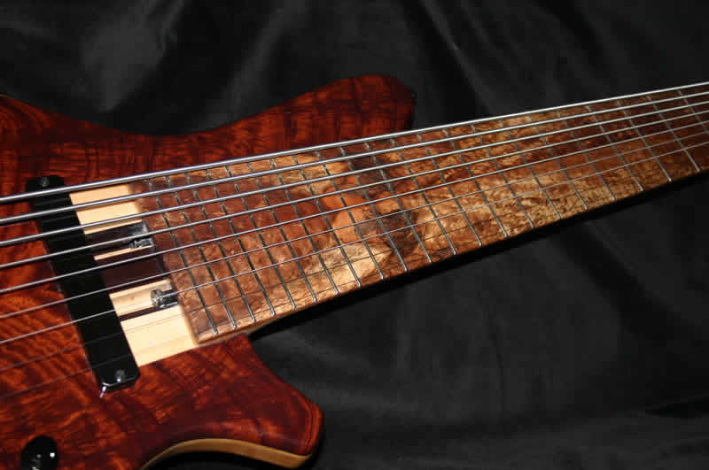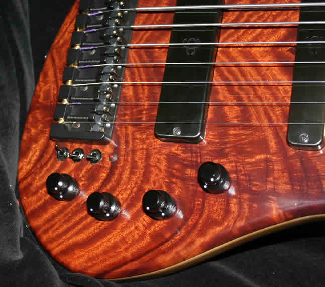 The body is swamp ash and the piece has been specially selected for its light weight. A black veneer is sandwiched between this and the mahogany top. The top not only has stunning figuring but the colour varies from light, orangey hues to dark brown. The black hardware compliments the colouring of the whole bass.