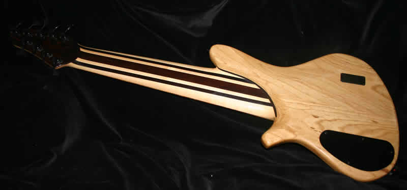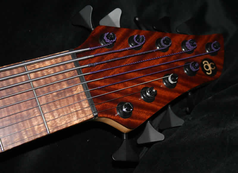 This ACG 9 string has the “Recurve Singlecut” shape and uses a set-neck, a glued joint, instead of the more usual thru-neck or bolt-on. This set-neck design is well executed and shaped with no ungainly mounds or troughs in the join between neck and body. The neck and body sandwich a “transition block” of wenge which, as well as being used when the neck and body are glued, gives a clean and handsome look to the finished joint.