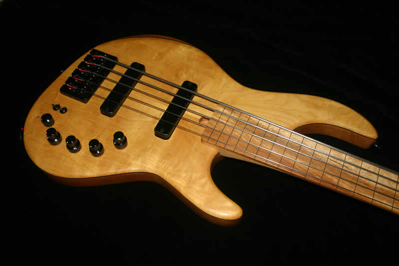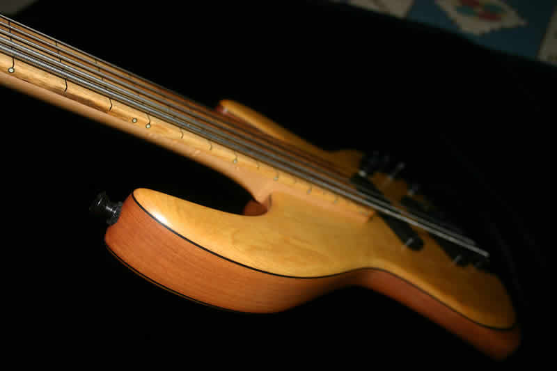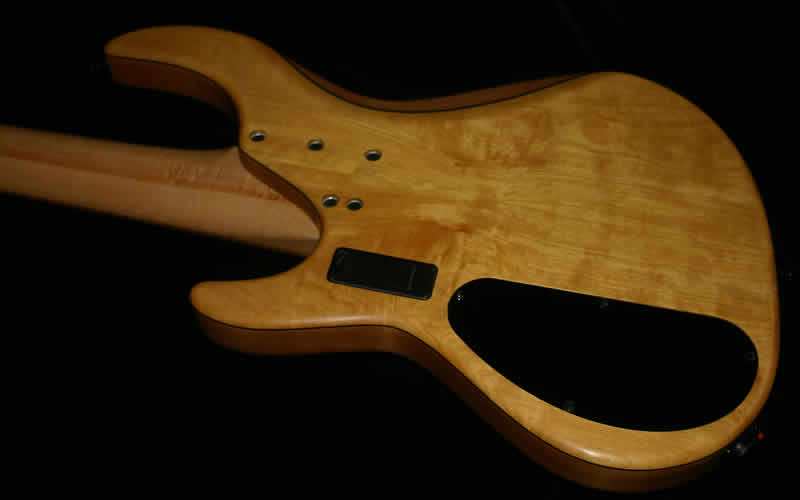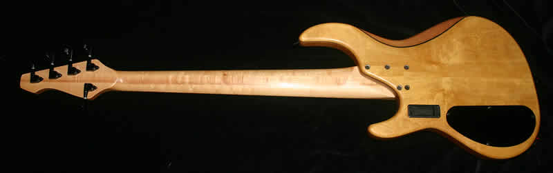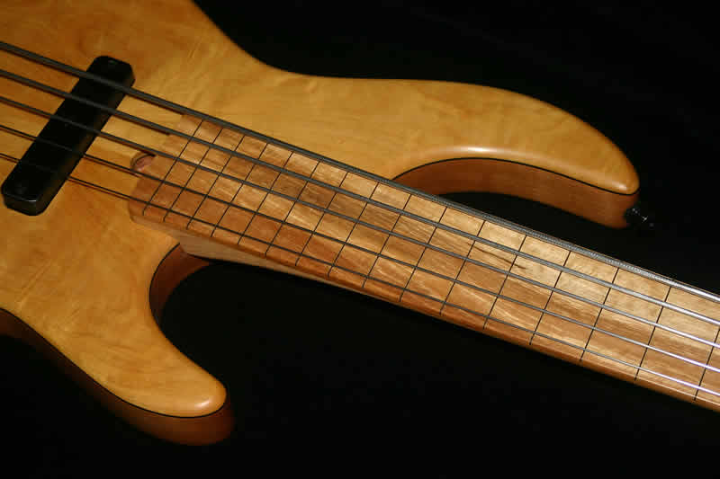 3 piece maple neck with Satinwood head and back plate. Acrylic Impregnated Satinwood board with black fretlines and Luminlay side dots.